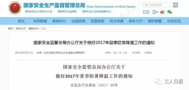 据国家安监总局官网5月17日消息,安监总局办公厅发布了《关于做好2017年夏季防暑降温工作的通知》,要求最大限度地减少劳动者高温中暑事件的发生。