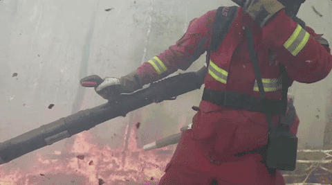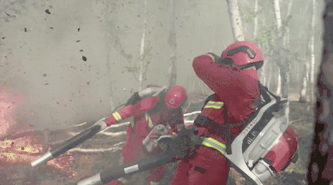在视频中可以看到,战士们操作风力灭火机(这种灭火机常见于森林灭火,体积小质量轻,其原理就是通过高速气流吹灭火苗,不过对于特别高的火苗也不适合风力灭火机),将火线上的明火,吹至燃烧过的区域,以免扩散。灭火机扫过,草木灰在空中飘散,战士们虽然用口罩或毛巾捂住了口鼻,但仍然挡不住浓烟的熏炝,因为要长时间作战,大家只能用水打湿面罩,稍做缓解。