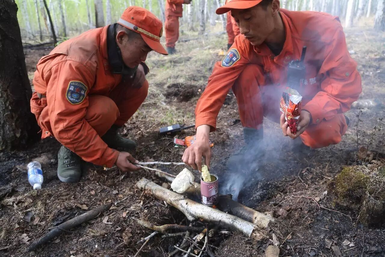 △呼伦贝尔消防支队战士张超用易拉罐煮方便面