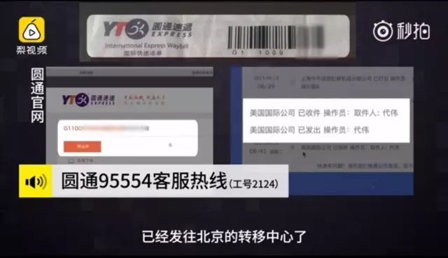 记者亲自测试所购“假单号”,圆通某快递显示某单号显示:“美国国际公司 已收件,已发出,已经发往北京的转移中心......”