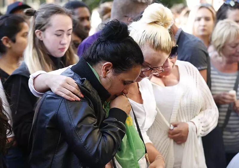 5月22日,在英国曼彻斯特发生爆炸的体育馆外,警察与民众交谈。 新华社/美联