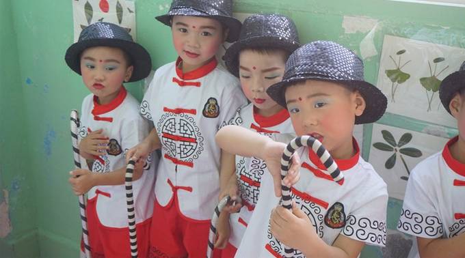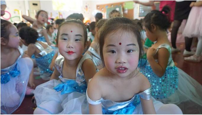 5月26日,大市场幼儿园的孩子们早早就来到幼儿园,换衣服化妆,准备“六一”文艺表演。