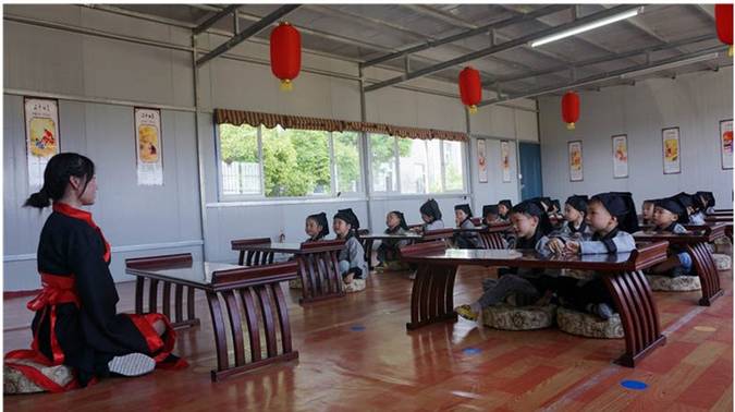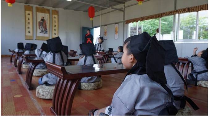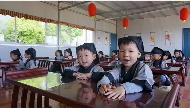 在福娃幼儿园的国学教室,小朋友们和老师一起背诵《弟子规》。