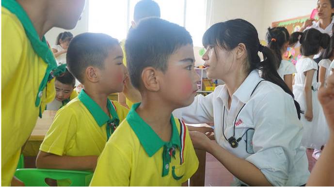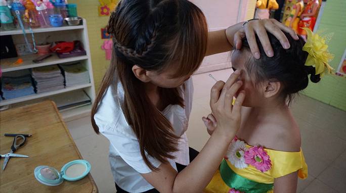 老师正在给即将登台的小朋友化妆。今天,福娃双语艺术幼儿园准备了41个形式多样的文艺节目,给全镇的父老乡亲带来一场主题为“传承文明 放飞梦想”“六一”儿童节汇演。