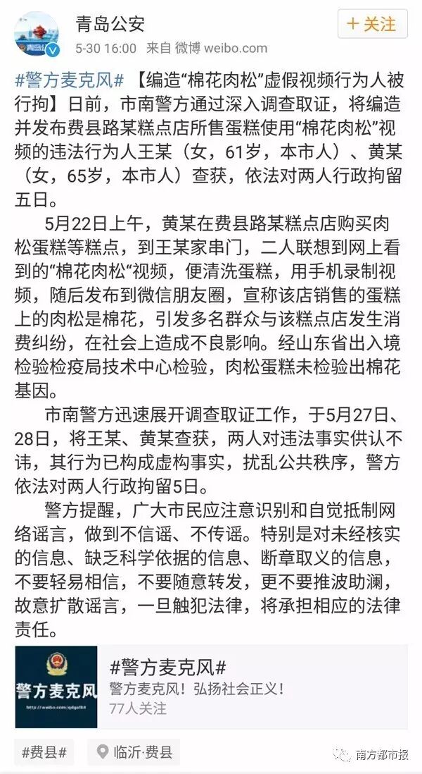 “编造‘棉花肉松’虚假视频行为人被行拘”