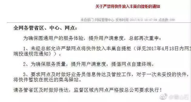 实际上,此前就有据网友爆料称,圆通速递昨天在内网发布通知称,严禁将快件放入顺丰旗下丰巢自提柜,提倡自建终端,对于一次性未妥投的快件,可以放在就近的菜鸟驿站,圆通内部要求严格执行相关政策。