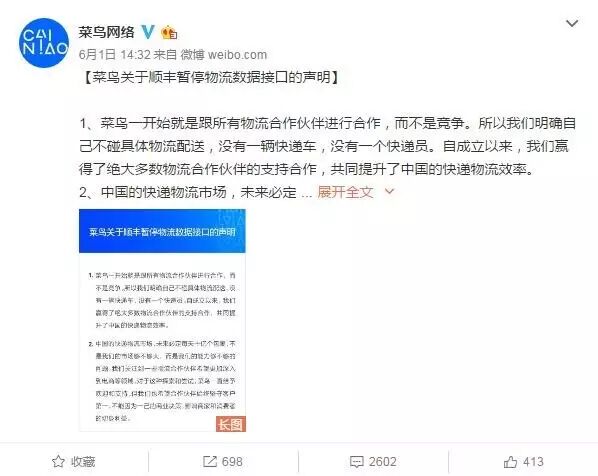 顺丰突然关闭物流接口,菜鸟发了一份这样的声明