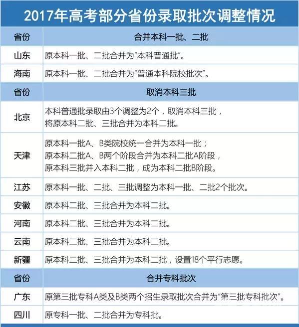 2017年起,山东省夏季高考将原本科一批、二批合并为“本科普通批”,合并后,该省高考录取减少至5个批次。海南省也对原本科一批、二批进行了合并,合并后各批次学校实行平行志愿投档和录取。此外,北京、天津、江苏、安徽、河南、云南、新疆等7个省份也相继取消了本科三批。