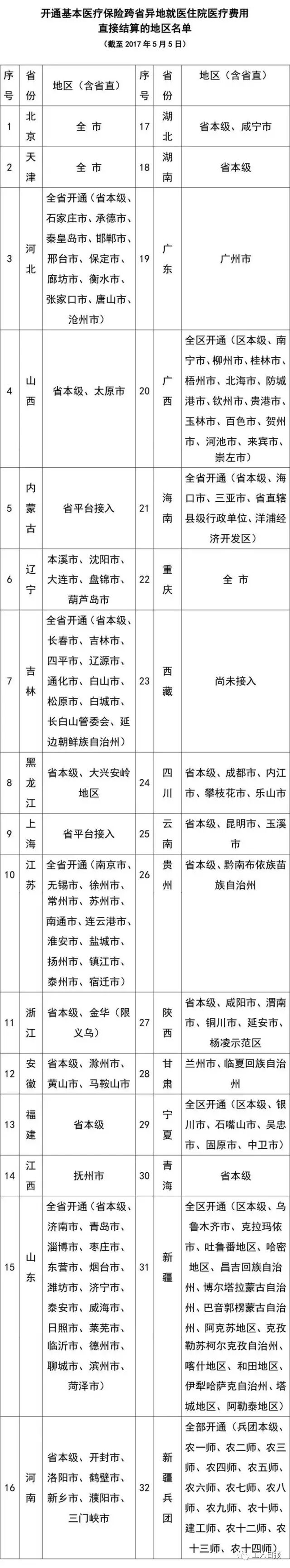 去年12月,国家基本医疗保险异地就医结算系统正式上线试运行,截至今年5月5日,除西藏外,全国各省份均整体或部分接入国家基本医疗保险异地就医结算系统,开通160个地区和1008家跨省异地就医住院医疗费用直接结算定点医疗机构。