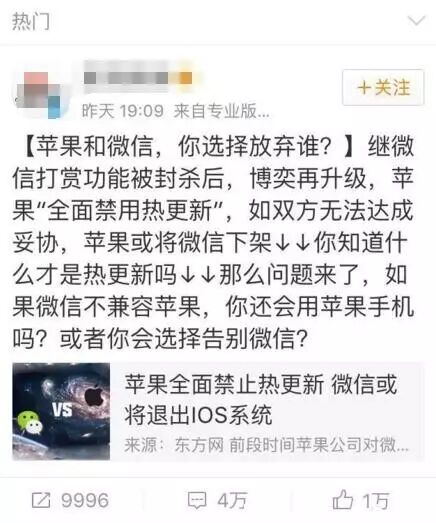 6日晚间开始,《苹果大招!6月12日微信或将退出IOS系统?网友都炸了》等内容在网上流传。流传内容核心表述大体为“继微信打赏功能被封杀后,博奕再升级,苹果‘全面禁用热更新’,如双方无法达成妥协,苹果或将微信下架。”