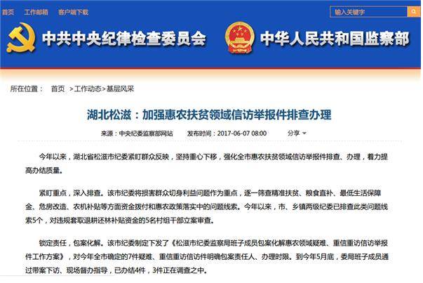 今年以来,湖北省松滋市纪委紧盯群众反映,坚持重心下移,强化全市惠农扶贫领域信访举报件排查、办理,着力提高办结质量。