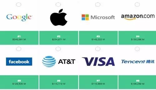 6、2017全球品牌百强榜单揭晓,位居前五的均为科技巨头,分别为谷歌、苹果、微软、亚马逊和Facebook。腾讯首次进入前十,位列第八。