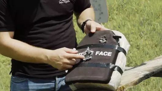 即使如此,这个防弹板只被打掉了表层,而没有破洞。