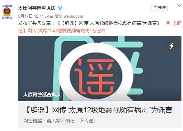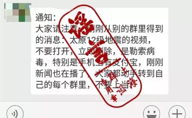5月中旬,一则“‘太原12级地震视频’带有勒索病毒”的消息在微信群中大肆传播:“大家请注意,刚刚从别的群里得到的消息:太原12级地震的视频,不要打开,立即删除,是勒索病毒,特别是手机上有支付宝的。刚刚新闻也在播了,大家都动手转到自己的每个群里,不要上当。”