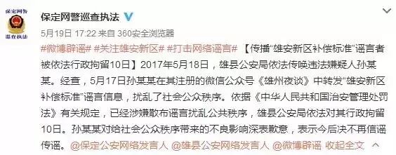 真相:所谓的“补偿标准”是一则不折不扣的谣言。此前,河北雄安新区临时党委、筹委会发布题为《坚持“以人民为中心”的理念认真制定好土地征迁政策》的明白纸。明白纸提出,目前,新区土地征迁工作正处于调查摸底、征求意见阶段,新区筹委会尚未以任何形式发布过任何内容的“征迁标准”。5月20日,雄县公安局依法对涉嫌传播“雄安新区补偿标准”谣言信息的孙某某做出行政拘留10日的处罚决定。