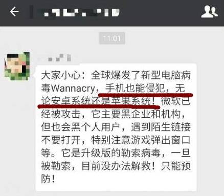 比特币勒索病毒“想哭”爆发后,关于手机会感染此病毒的传闻此起彼伏。各种信息在社交网络平台大肆传播,有传言称,“全球爆发了新型的电脑病毒‘想哭’,手机也会被侵入,无论是安卓系统还是苹果系统!”同时还称,“这是升级版的勒索病毒,一旦被勒索,目前没有办法解救,只能预防!”