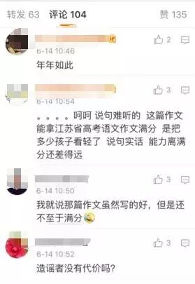 网友:说句难听的,这篇作文能拿江苏省高考语文作文满分是把多少孩子看轻了,说句实话,能力离满分还差得远。