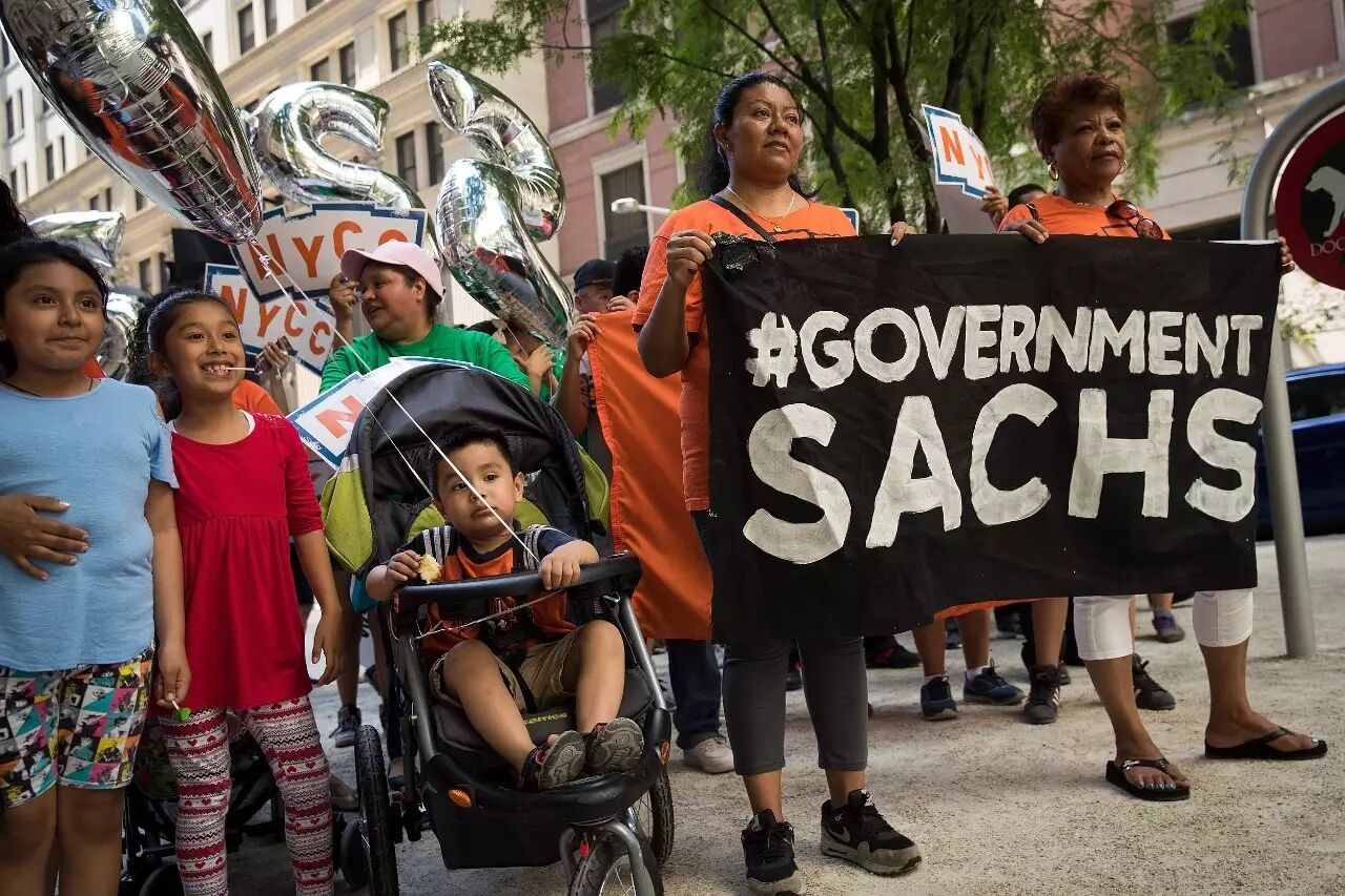 当地时间2017年6月12日,在美国纽约,大量低薪工人和支持者举行游行抗议,呼吁美联储不要加息。