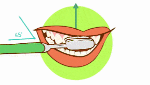 将牙刷斜立呈45度角,用短、垂直或轻轻打圈的方式温柔刷。不要跨越上下牙一起刷。