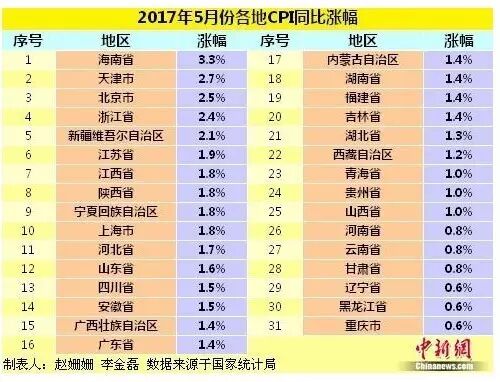 1、31省份5月CPI出炉,28个省份5月CPI同比涨幅较4月出现不同程度扩大。其中,海南省5月CPI涨幅迈入“3时代”,为全国最高。