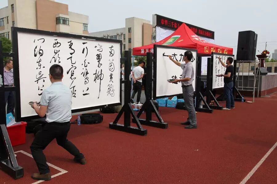 钟页、胡继川、李绪明三位书法家现场挥毫,创作书法作品,为师生们展示书法艺术的独特魅力。学校操场上,千名学子凝神静气,端坐于桌前,在宣纸长卷上泼墨挥毫练习书法,小篆、楷书、隶书,字字入心入目,彰显书香校园和书法教育特色。
