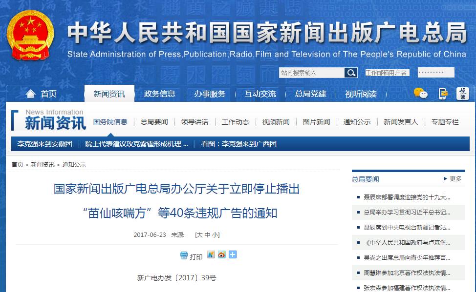 6月23日下午,国家新闻出版广电总局在官网发布通知,要求各省、自治区、直辖市新闻出版广电局,新疆生产建设兵团新闻出版广电局,中央三台、电影频道节目中心、中国教育电视台等立即停止播出“苗仙咳喘方”等40条违规广告。