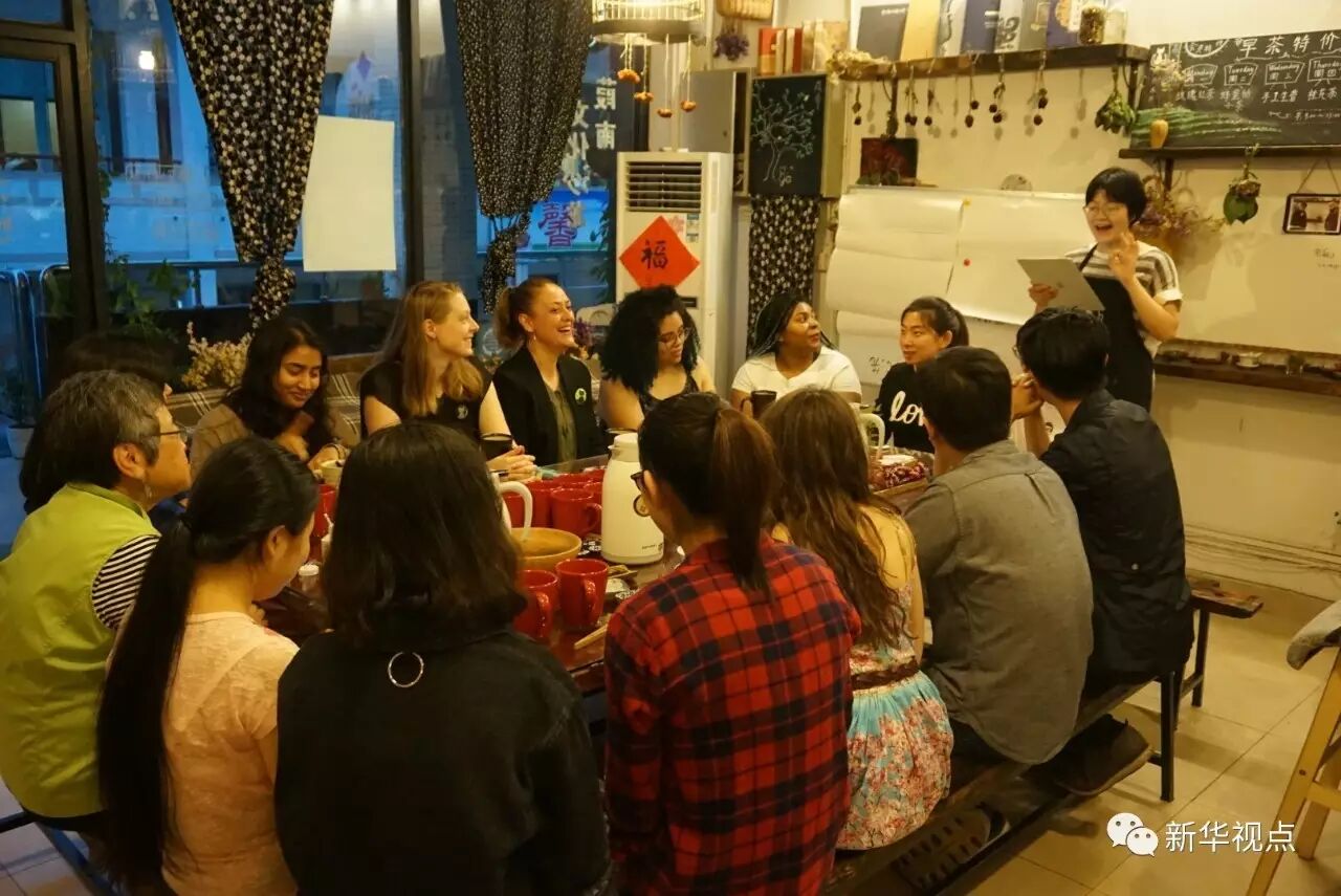 四川大学在校生王晓玲是葭南茶舍江安店的创始人,图中中美大学生在她搭建的文化传播平台上交流人生,畅想未来。