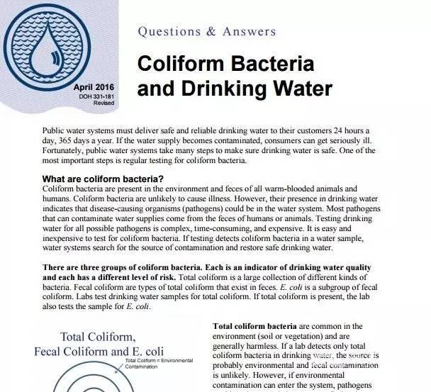 华盛顿州卫生局报告显示,粪大肠菌群通常被作为水质状况的“晴雨表”。如果饮用水源中被检测出含有粪大肠菌群,通常意味着水质恶劣,可能含有其他病菌,需要卫生局立刻展开全面调查。