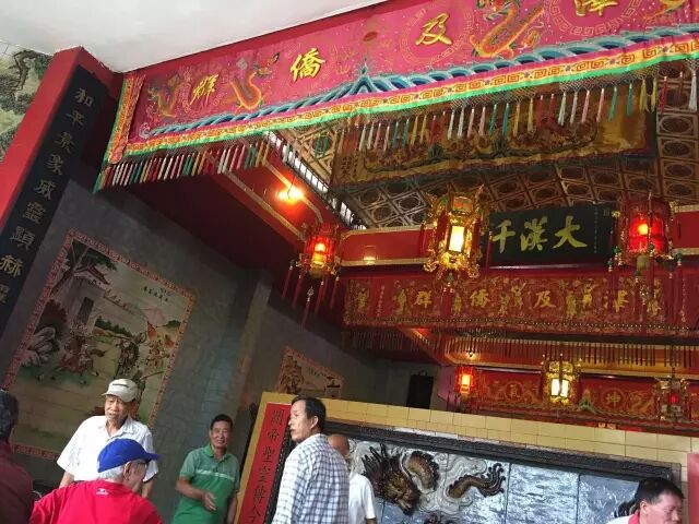 从楼梯上去,就是百米见方的关帝庙,庙的四周墙壁上用彩色瓷砖拼接起桃园三结义、三顾茅庐等故事,从天花板上悬下的红色横幅上写着:泽及侨群。