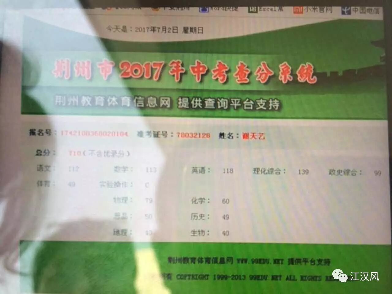 今天(7月12日)下午2点,荆州市2017年中考成绩出炉。荆州市实验中学考生谢天艺同学以710分的高分,取得全市中考第一名的好成绩。