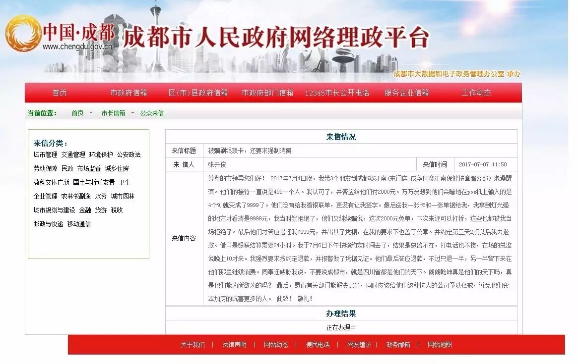 7日,张先生去往辖区的工商所讲述了事件的经过,另一方面,他去往市长信箱反映了自己的遭遇。8日下午,记者注意到,市长信箱显示张先生的反映“正在办理中”。