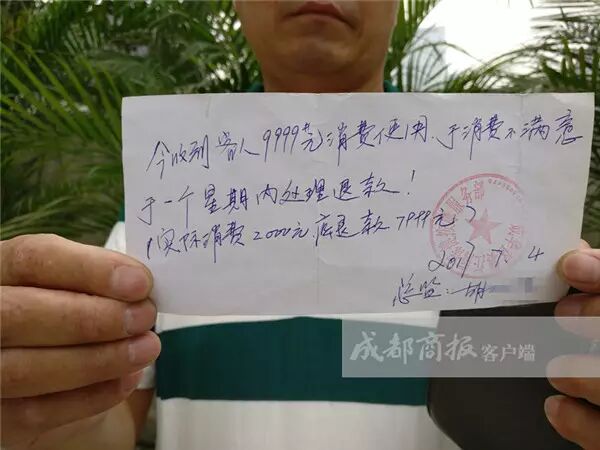 张先生表示,当时感觉写得并不明白,他特意要求对方补充了一句:“实际消费2000元,应退款7999元。”纸条署名为“总监:胡某某”。