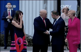 特朗普访问波兰时表示,美国敦促俄罗斯停止在乌克兰和其他地区破坏稳定的活动。不过,在合影结束后,特朗普却遭遇了一次尴尬的握手经历:当他伸手准备同波兰第一夫人阿加塔握手时,阿加塔没有注意到,略过特朗普径直与梅拉尼娅握手交谈。