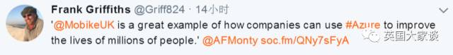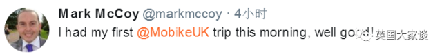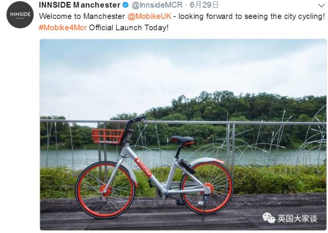 “今天首次尝试共享单车,很棒,骑起来很舒服,APP也很容易用。希望在曼城取得大成功!”