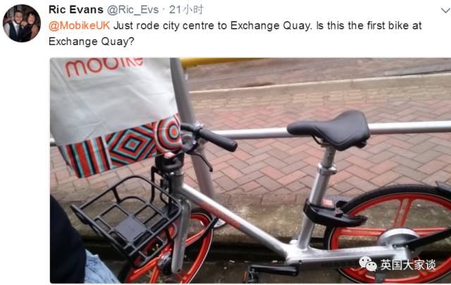 “刚刚骑到Exchange Quay。貌似是第一辆达到这里的共享单车?”