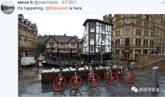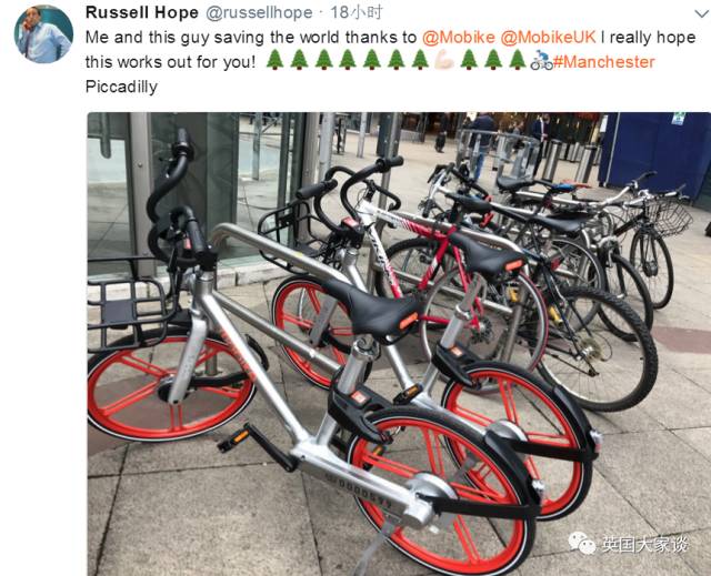 “哇哦,在曼城看见共享单车,瞬间感觉自己在上海,很好奇共享单车以后会在这发展成什么样子……”