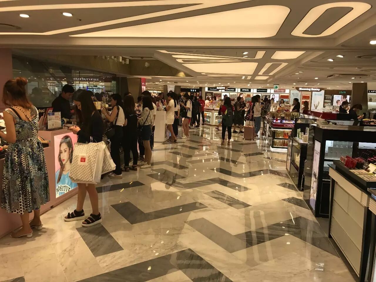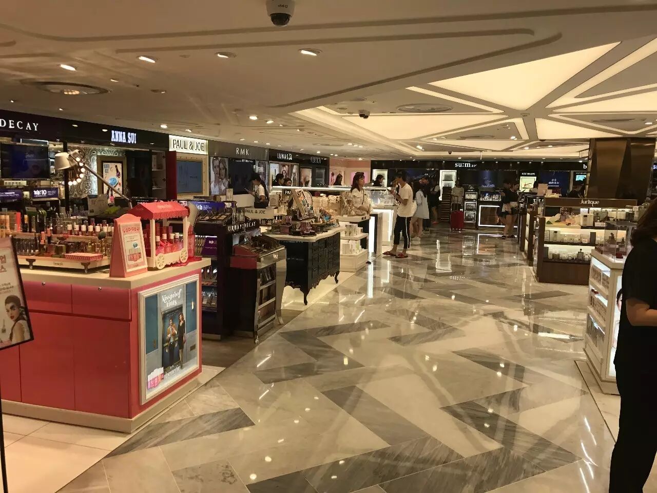 名牌高档箱包店面基本无人问津,在更受中国游客欢迎的化妆品柜台有一定数量的游客。一些较受欢迎化妆品柜台的地上摆放着一些包裹好的商品,据称是当天顾客购买后存下寄送的。
