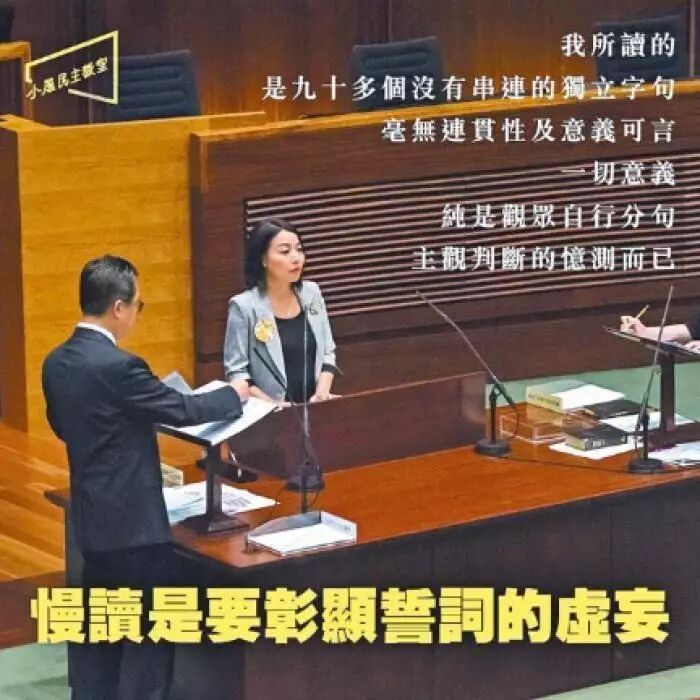刘小丽在宣誓时以不正常语速读出规定誓词,80个字的誓词耗时近13分钟。其后,刘小丽又在社交网站中承认“慢读是要彰显誓词的虚妄”。