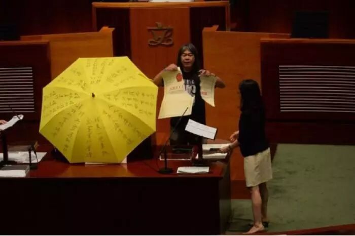 梁国雄在宣誓仪式上,手持黄伞断续地读出誓词,刻意在“效忠”之后将“中华人民共和国”和“香港特别行政区”断读为“中华人民”“共和国”和“香港”“特别行政区”,并高呼“撤销人大8.31决议”等口号,最后撕破手上的基本法纸板,将纸碎撒在地上。